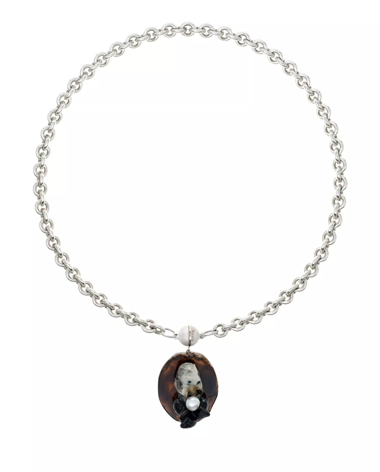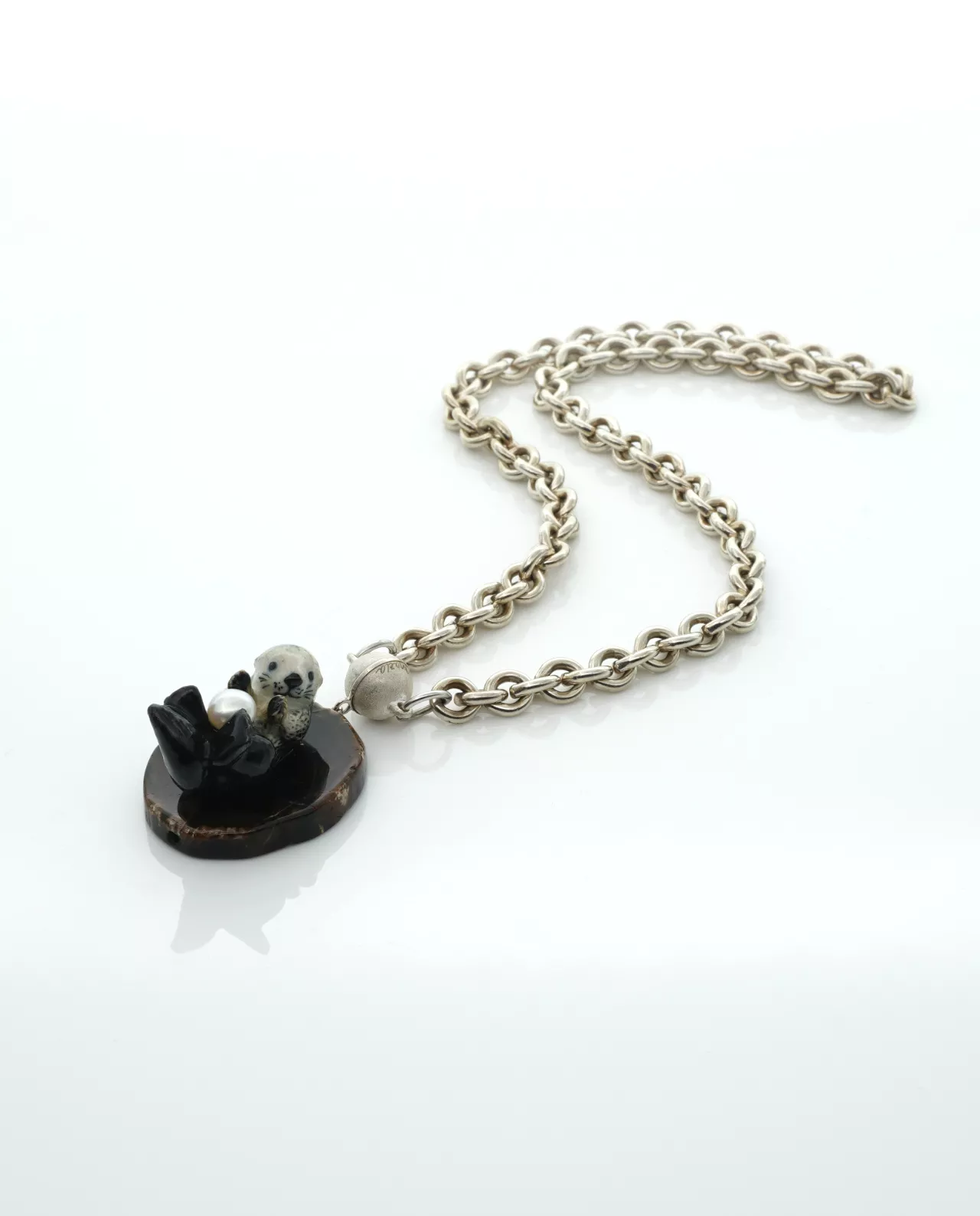 Necklace 925 Ag , 925 Ag magnetic clasp with 925add on, agate slice , handmade porcelain animal , Akoya pearl , length 4 cm