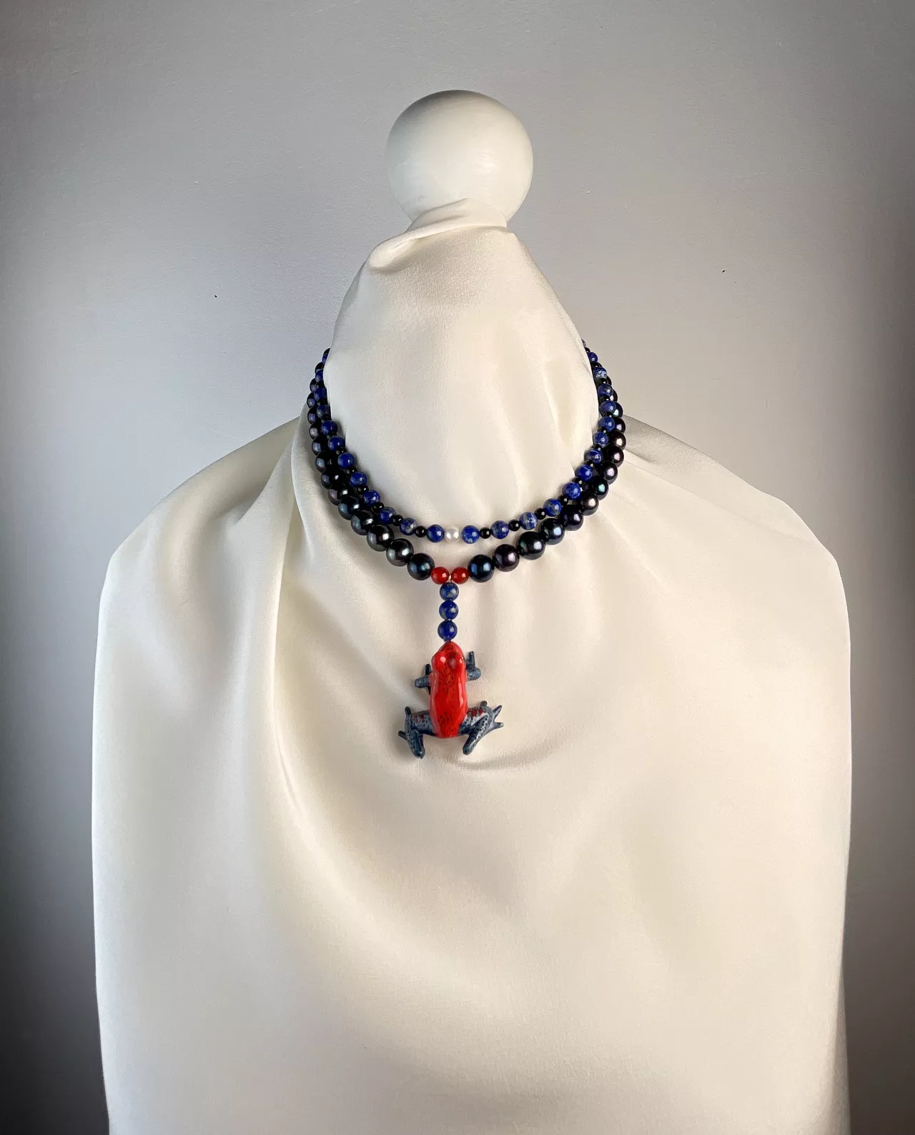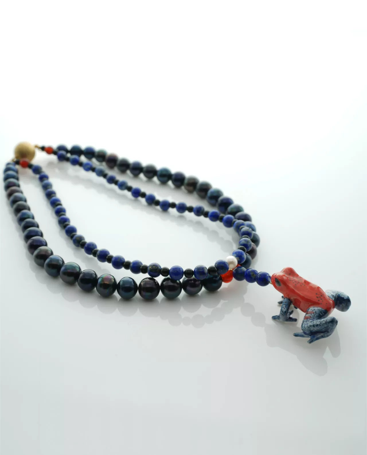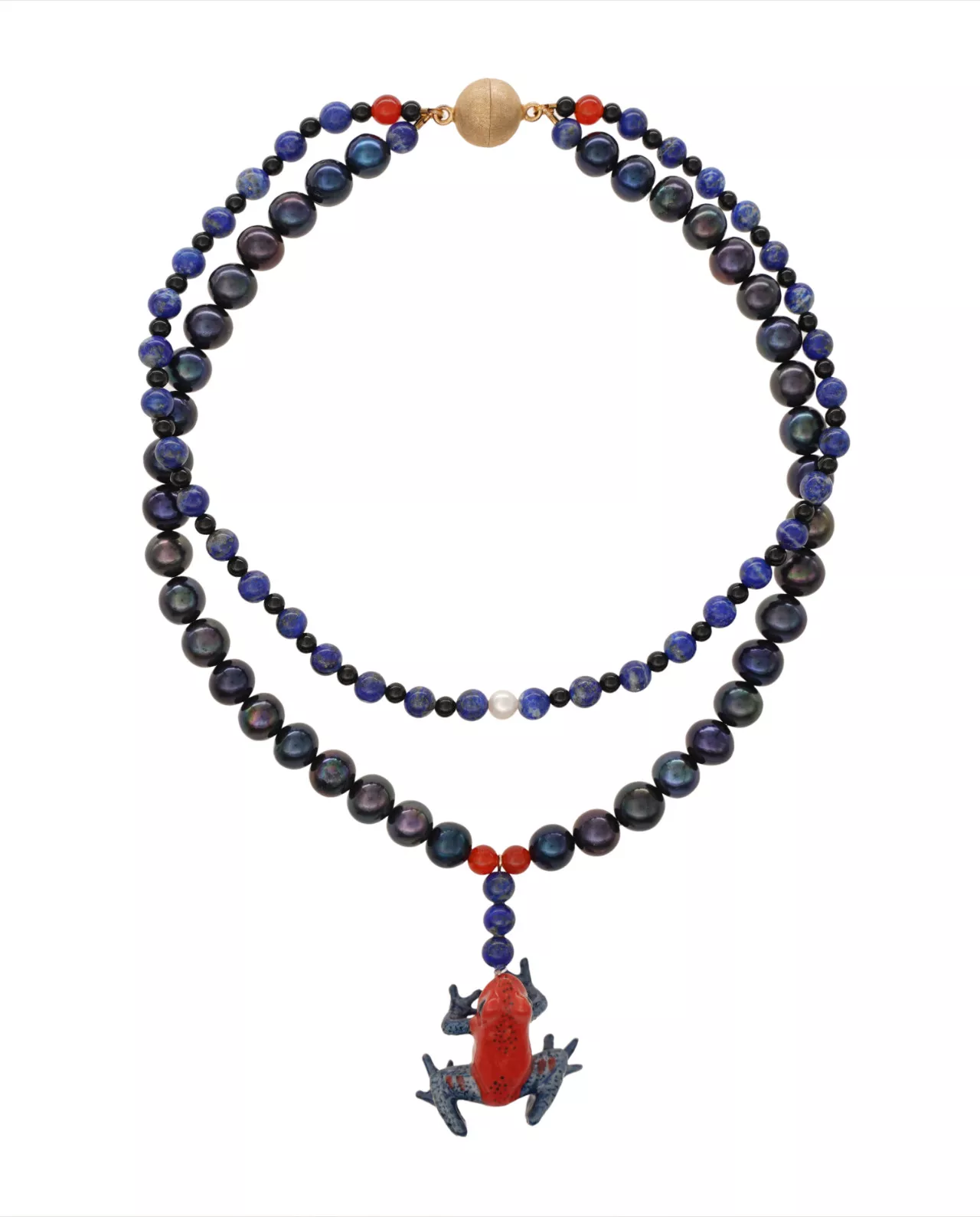 Freshwater pearls black, lapis lazuli, carnelian, onyx, Akoya pearl, handmade porcelain animal, 925 magnetic clasp gold plated , 54 cm length