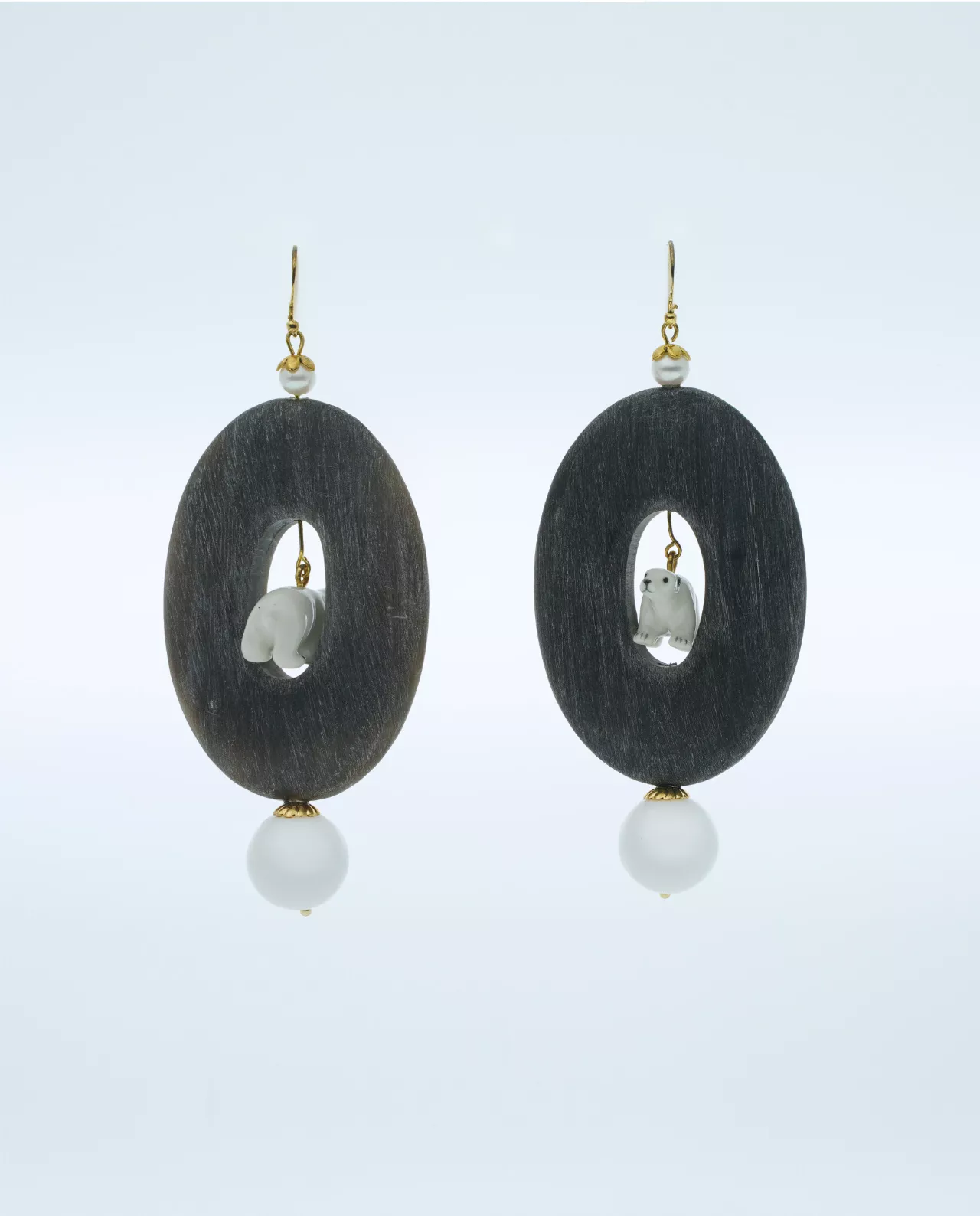 Agate , Akoya pearl, brushed buffalo horn, handmade porcelain animals,18 ct yellow gold ear hooks