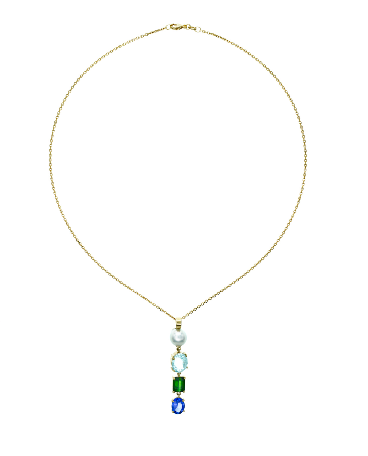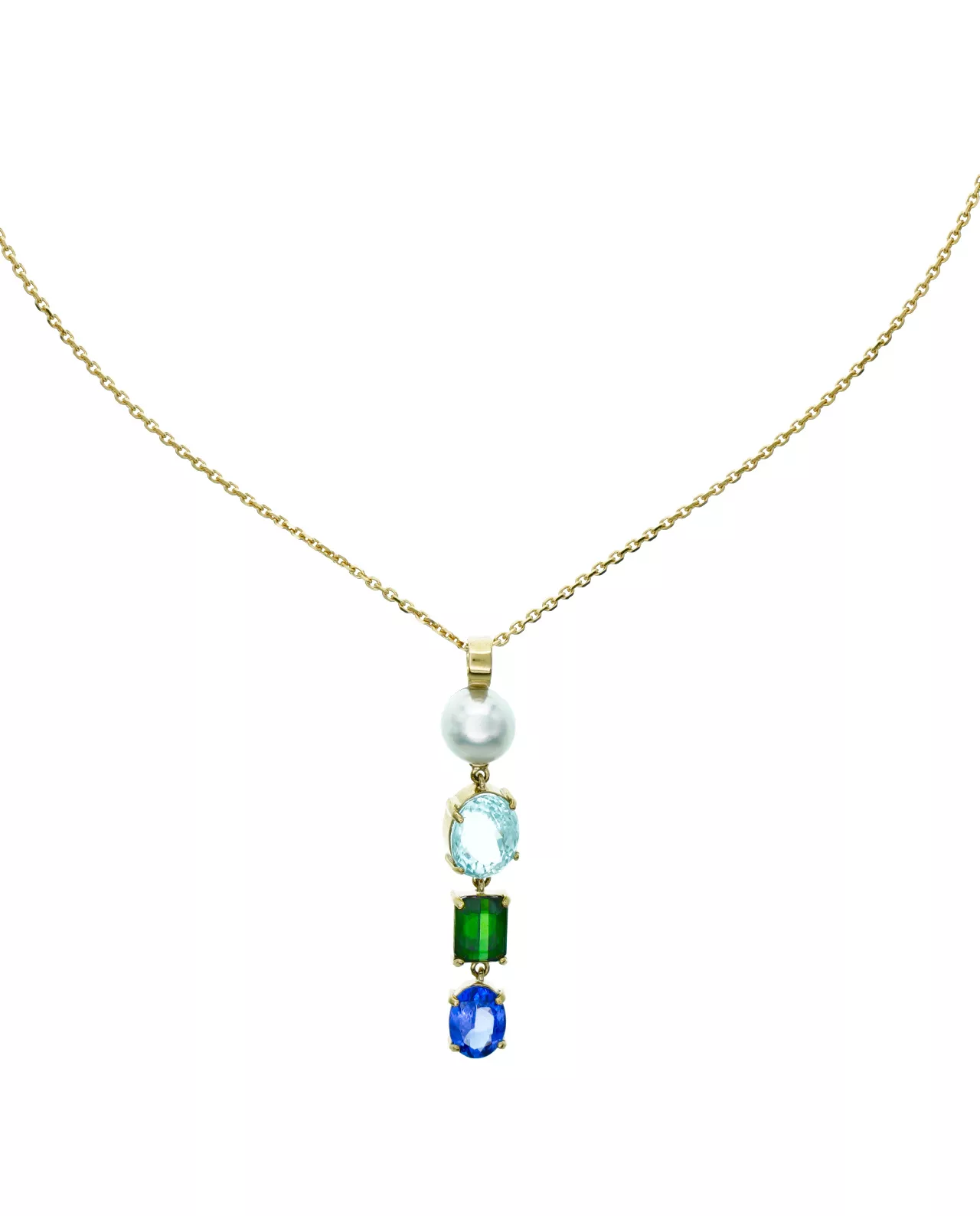 This pendant is a wonderful accessory . Its finely matched selection of gemstones, topped off with a South Sea pearl, and its 750 yellow gold setting make it a unique piece of jewelry. Its classic-looking design is a perfect complement to any outfit and is sure to make it a lifelong companion .