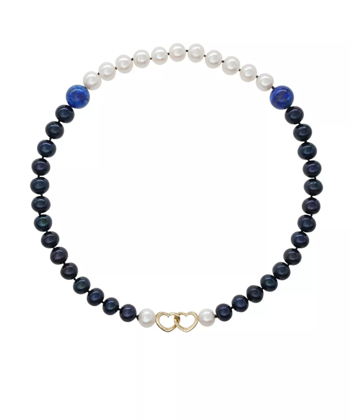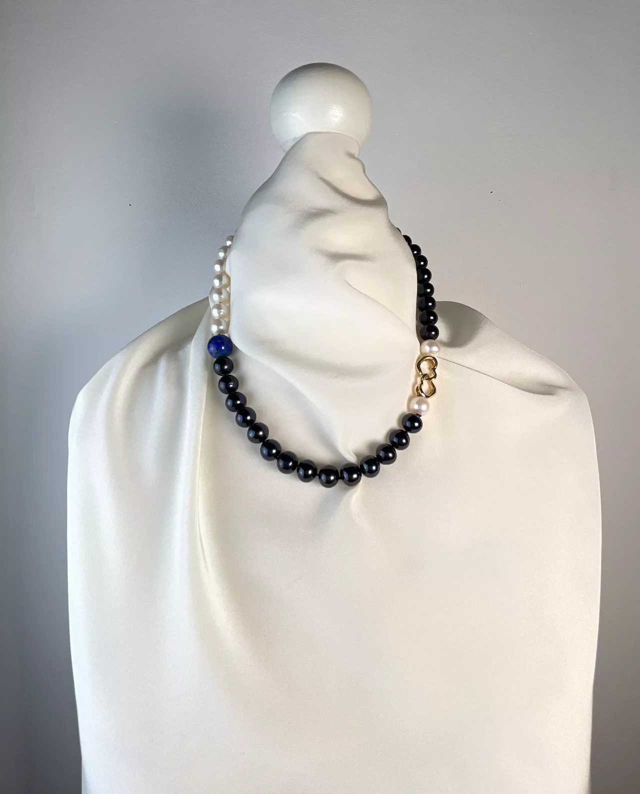Lapislazuli, Schwarze Süsswasserperlen, weisse Süsswasserperlen , Verschluss 750 Gelbgold, 50cm Länge
