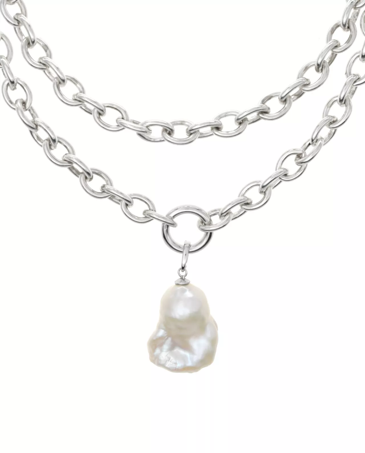Die Symphonie aus schwerer langer Silberkette und prächtiger XXL Barockperle sorgt für einen rockigen und doch elegant ausdrucksstarken Look. Ganz gleich , ob du die Kette in voller Länge um den Hals trägst oder sie doch lieber doppelt umlegst, sie ist wirklich ein Statement Piece.