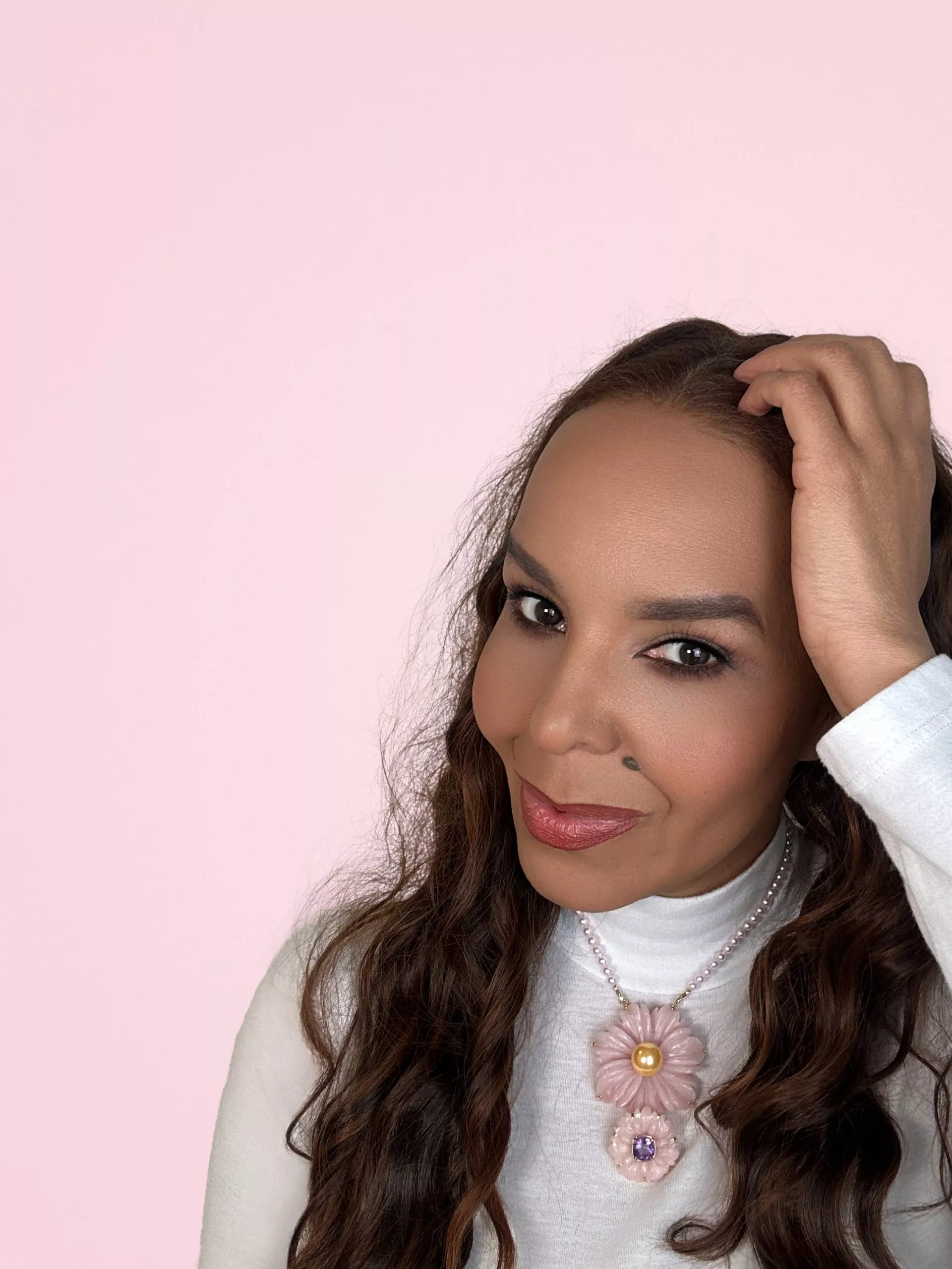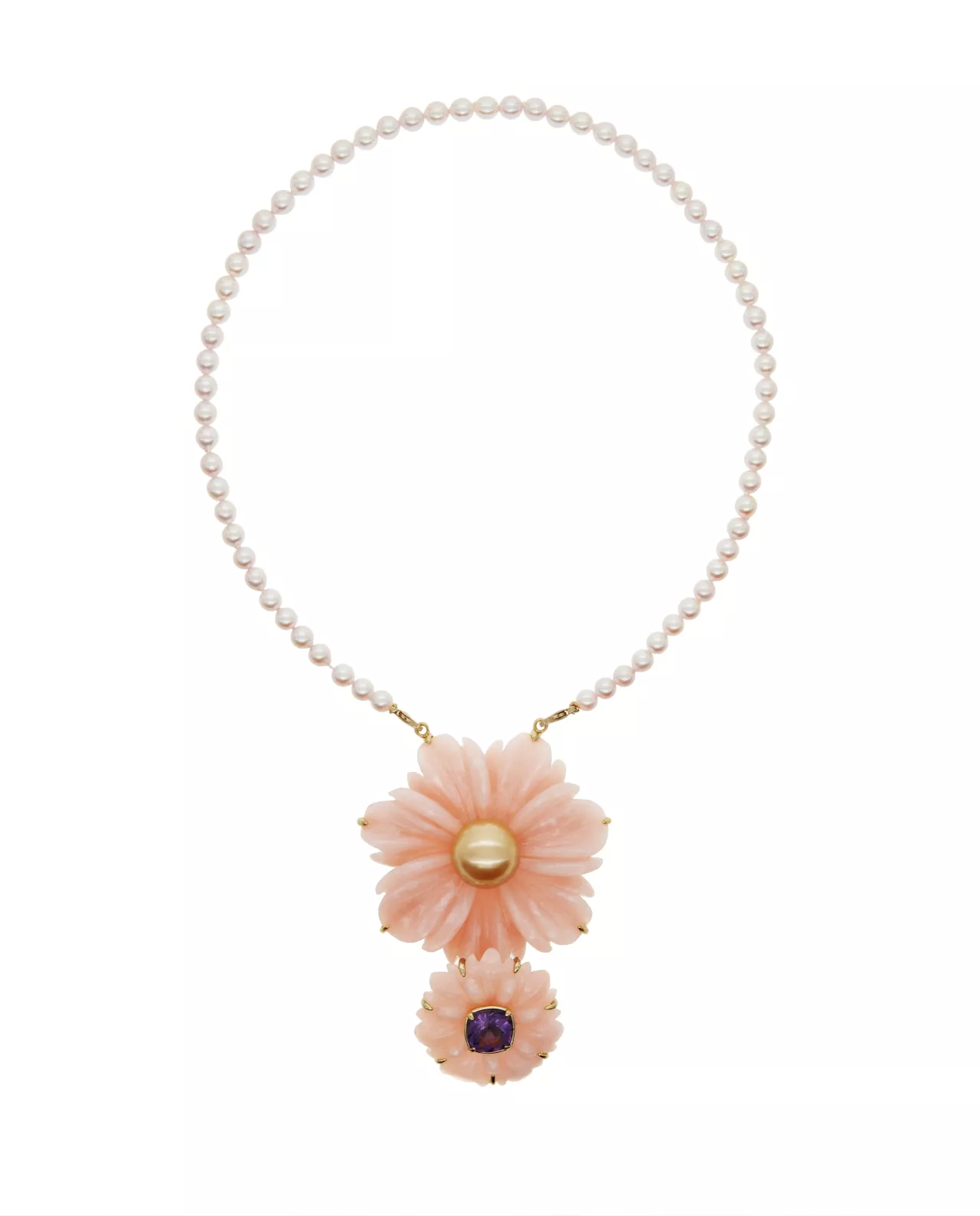 Zwei skulpturale Blüten aus handgeschnitztem pinkem Opal, kombiniert mit der warmen Tiefe einer goldenen Südseeperle und einem Amethyst in klarem Violett: Dieser Anhänger ist kein Accessoire, sondern ein Statement. Gefasst in 18 Karat Gelbgold entsteht ein Stück, das sichtbare Weiblichkeit zeigt – nicht lieblich, sondern souverän.