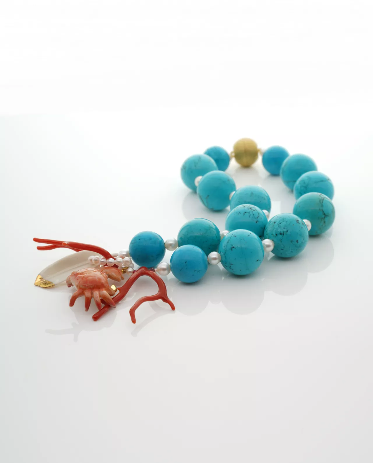 Türkis, Akoya Perlen weiss , handgefertigte Porzellan Tiere, Rote Koralle, 925 Magnet Verschluss vergoldet, 46 cm Länge