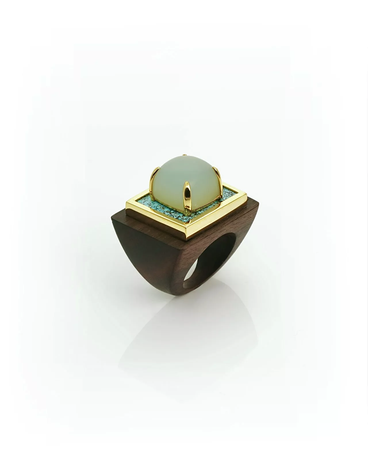 Das dunkle Ebenholz lässt die Edelsteine besonders leichtgewichtig wirken. Im Gesamten betrachtet , wirkt der Ring , vor allem wegen des Cabachons in mattem finish on top, wie eine dicke, bunte Schokoladenpraline.
