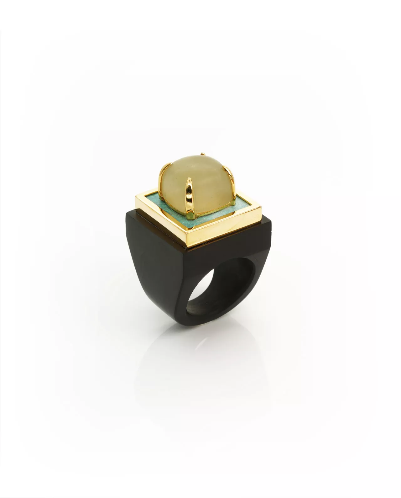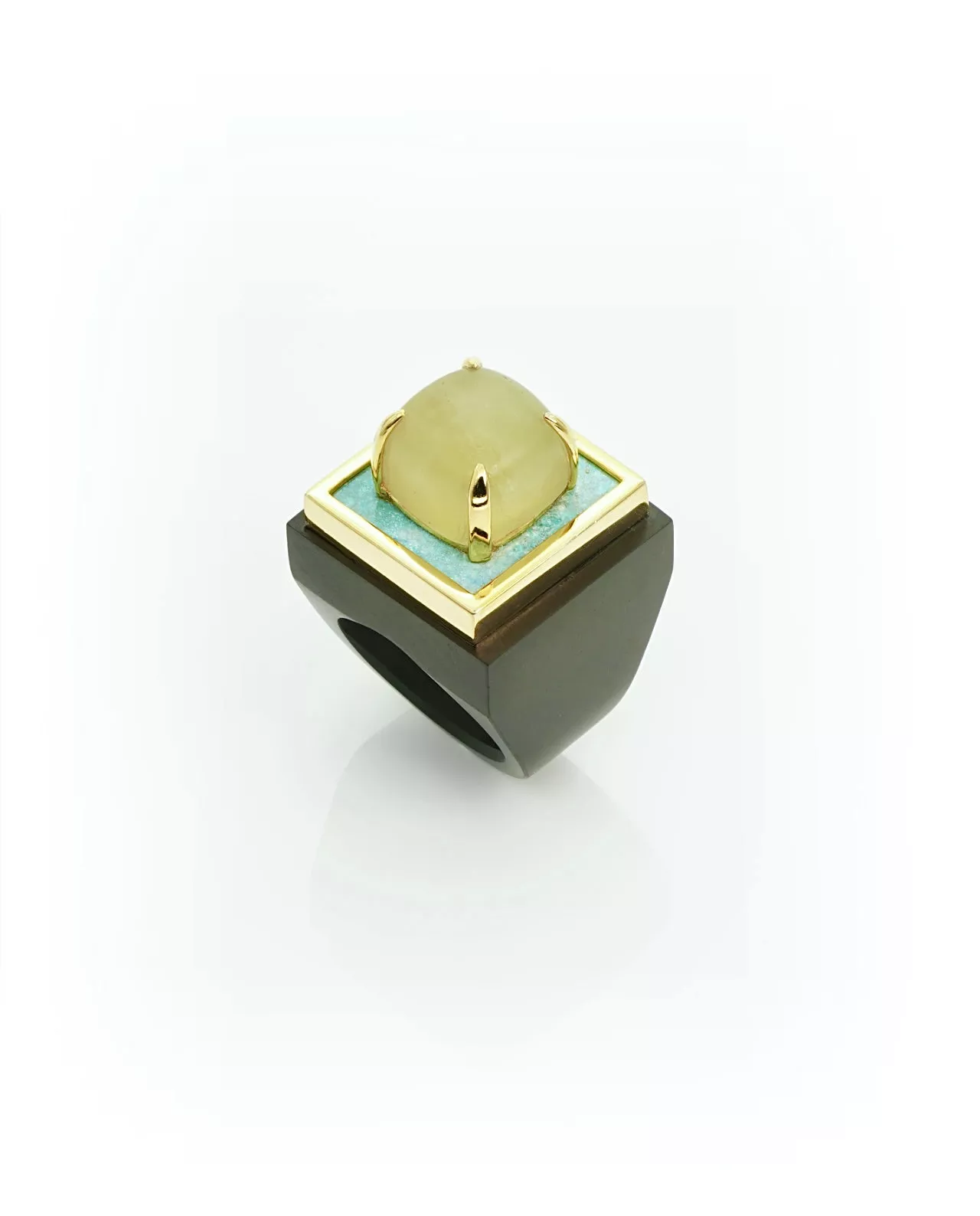 Das dunkle Holz lässt die Edelsteine leichtgewichtig erscheinen . Im Gesamten betrachtet, wirkt der ganze Ring vor allem wegen  des Cabachons in mattem finish on top, wie eine bunte dicke Schokoladenpraline.